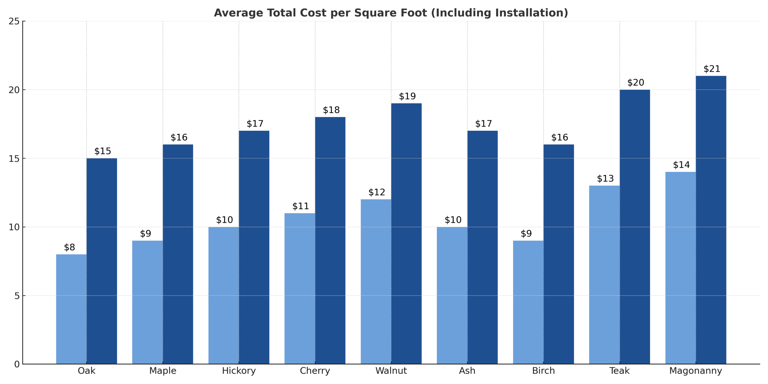 Hardwood Species | Average Cost per Square Foot (Materials Only) | Average Total Cost per Square Foot (Including Installation) |